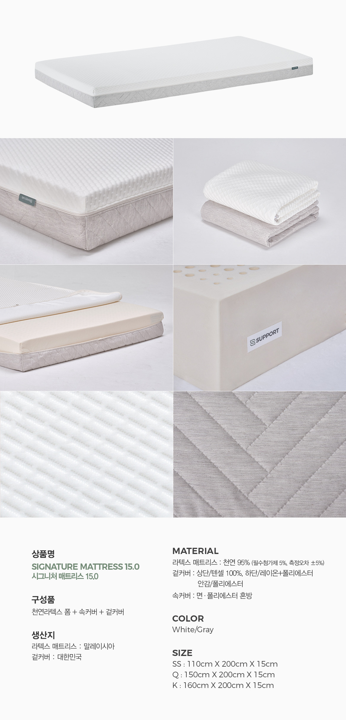 15cm 두께의 매트리스는 더 깊은 쿠션감으로 라텍스 매트리스 고유의 포근한 탄성을 가장 완벽하게 제공합니다.