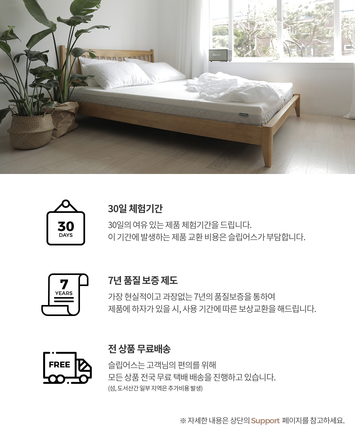 - 슬립어스는 고객님의 편의를 위해 5만원 이상 전국 무료 택배 배송을 진행하고 있습니다. (단, 섬, 도서산간지역 등 일부 지역은 추가 비용 발생)